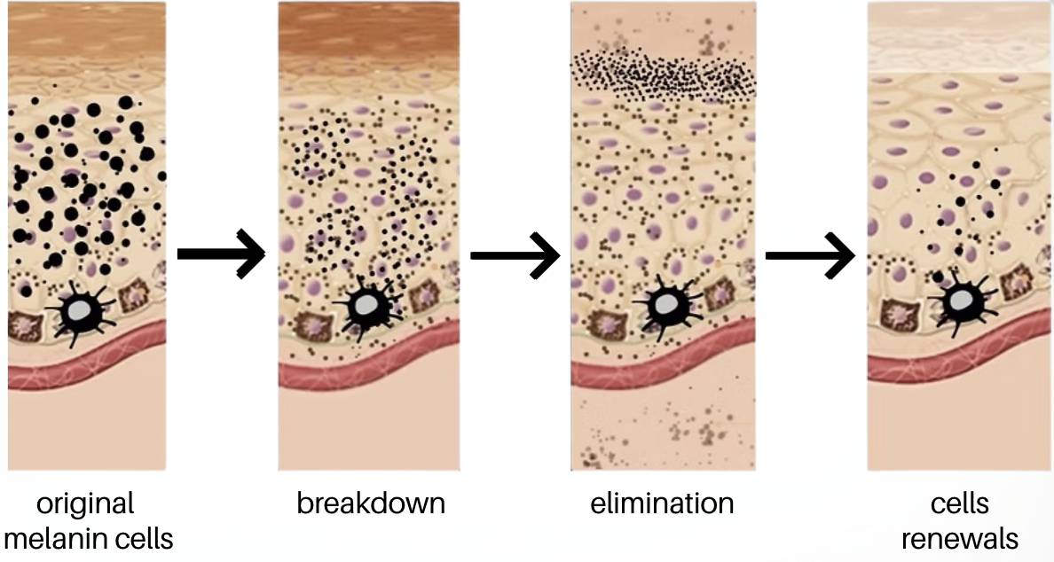 Excess pigmentation is gradually released as the skin regenerates to mimic the lightest shade of your cells